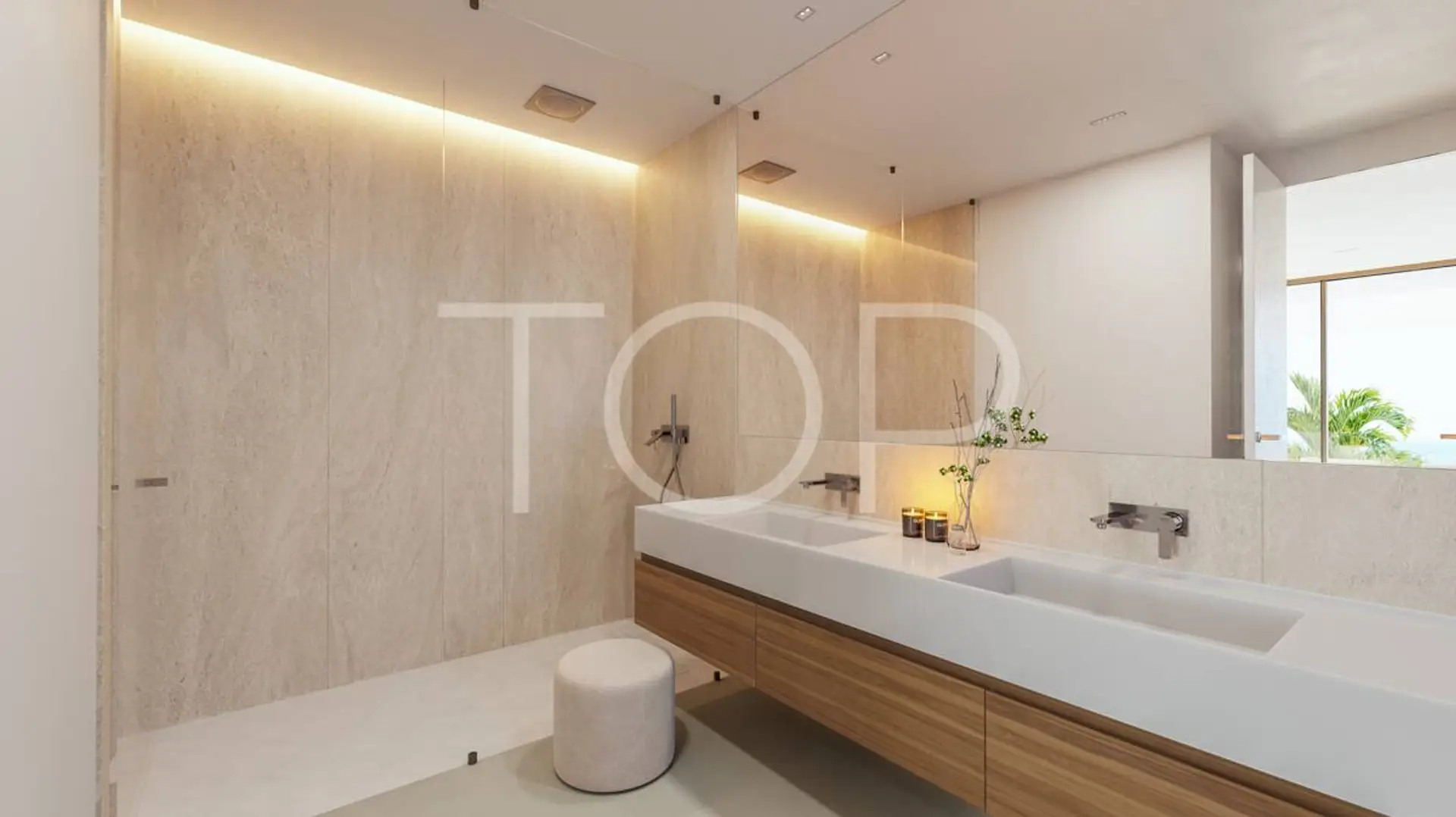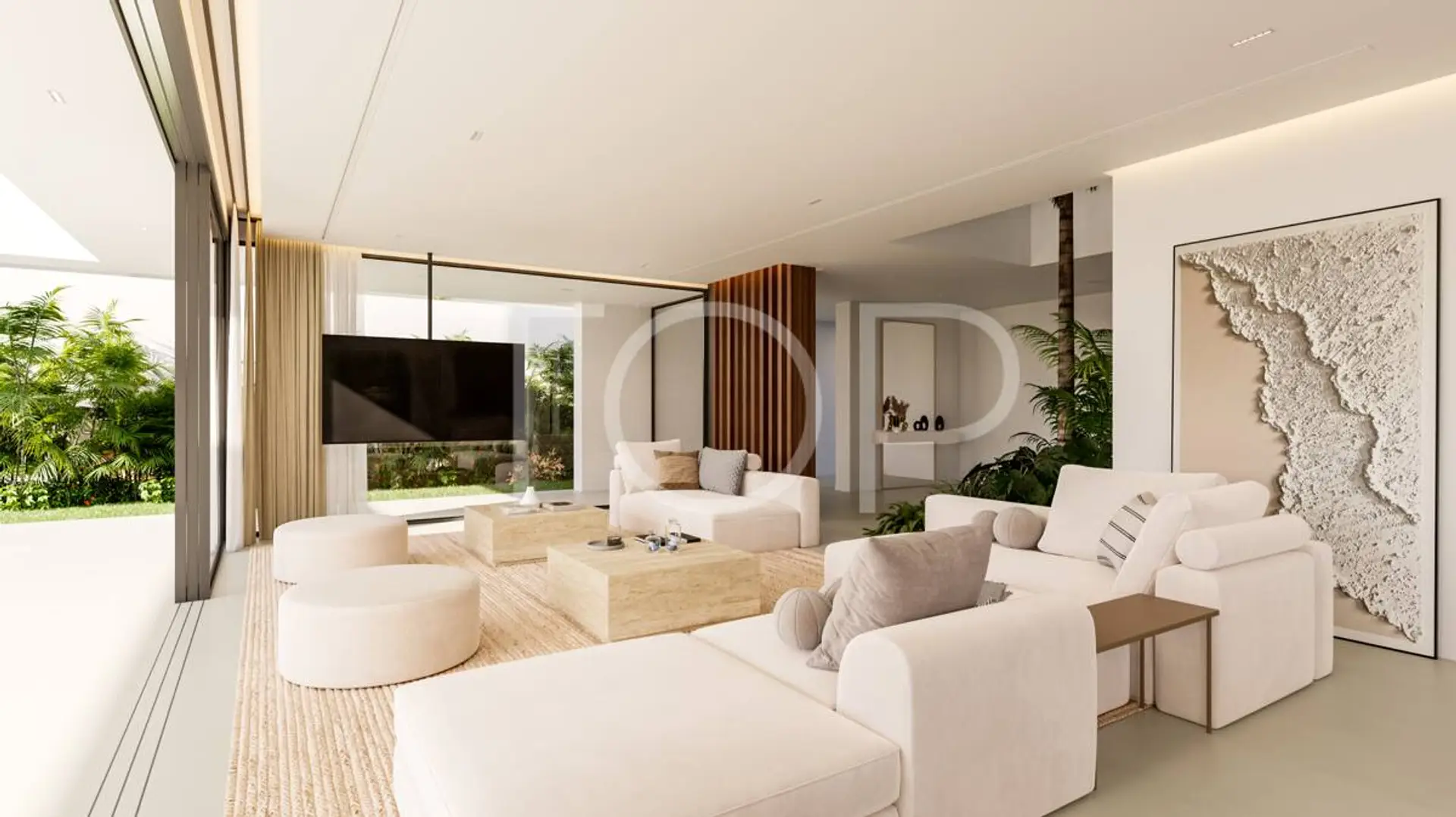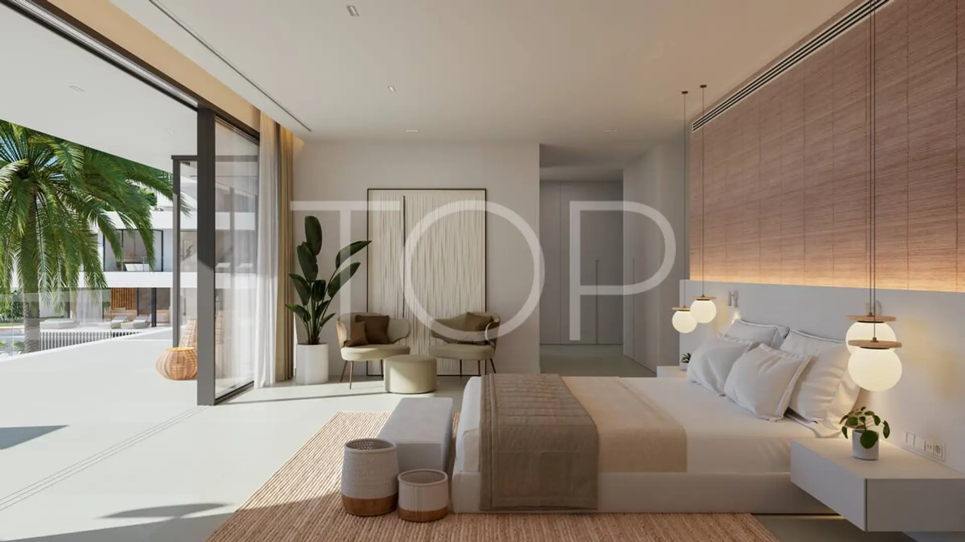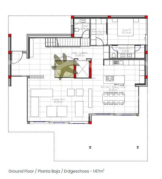 Über den Eingang gelangt man in das Erdgeschoss, das einen großen Wohn- und Essbereich mit offener Küche umfasst. Durch bodentiefe Fenster gelangt man auf die vordere Terrasse mit Infinity-Pool. Im Erdgeschoss befinden sich auch ein Gäste-WC und ein Schlafzimmer mit eigenem Bad und Zugang zum Garten. Im Obergeschoss befinden sich das Hauptschlafzimmer mit Ankleideraum und eigenem Bad sowie zwei weitere Schlafzimmer mit eigenen Bädern.