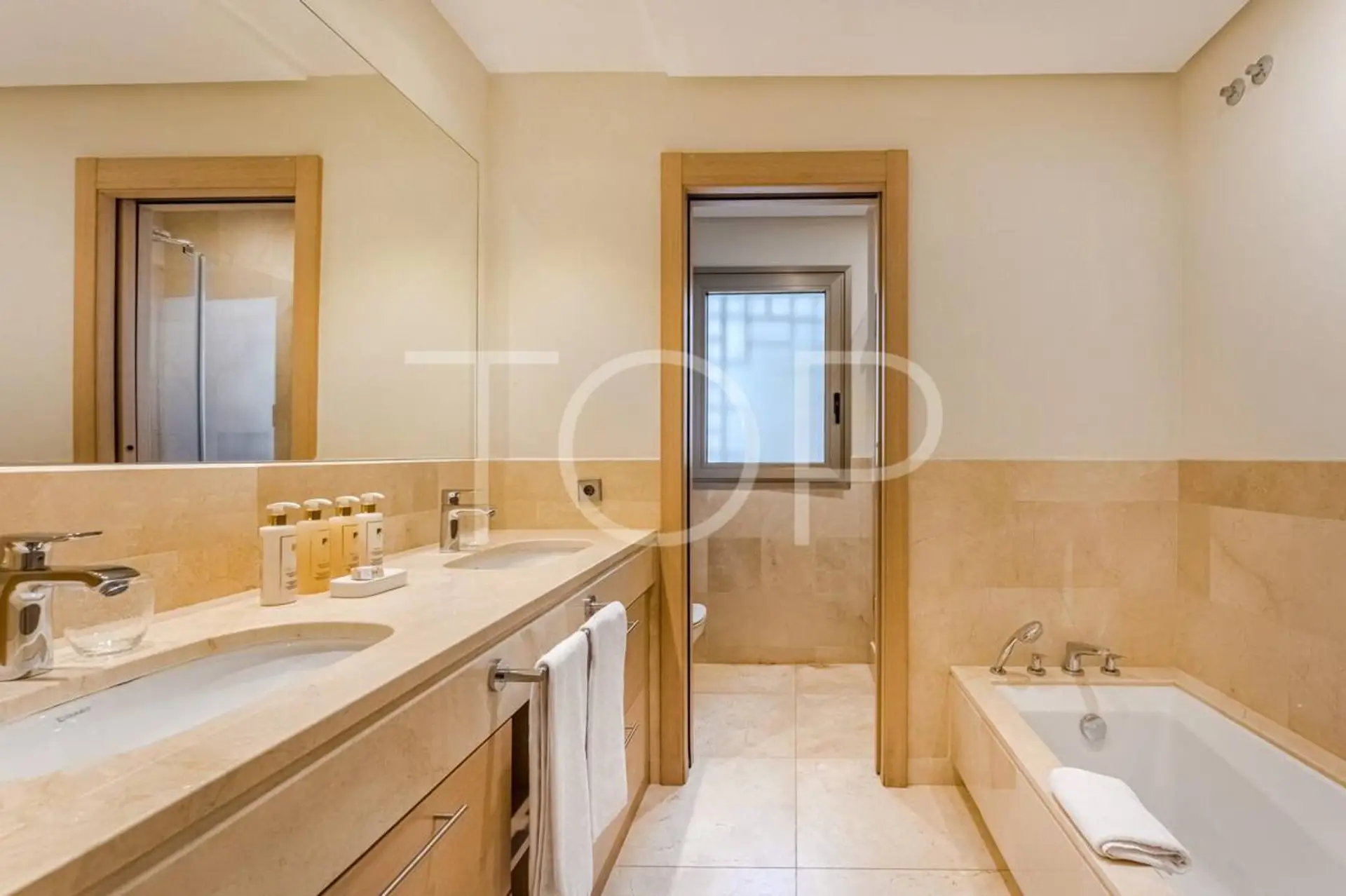 Der Innenbereich ist offen gestaltet: Die moderne, voll ausgestattete Küche mit hochwertigen Elektrogeräten geht nahtlos in den Wohn- und Essbereich über. Das Apartment verfügt über zwei Schlafzimmer und zwei Badezimmer, die mit erstklassigen Materialien und viel Liebe zum Detail gestaltet wurden, um höchsten Wohnkomfort, Eleganz und Privatsphäre zu gewährleisten.