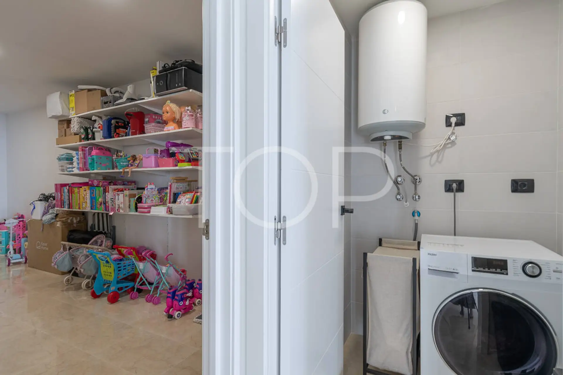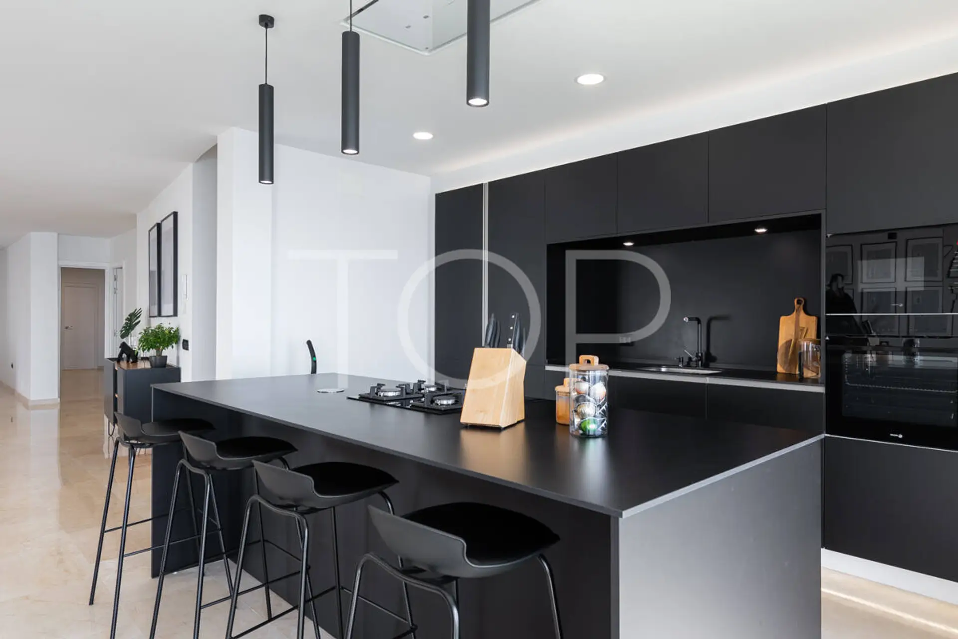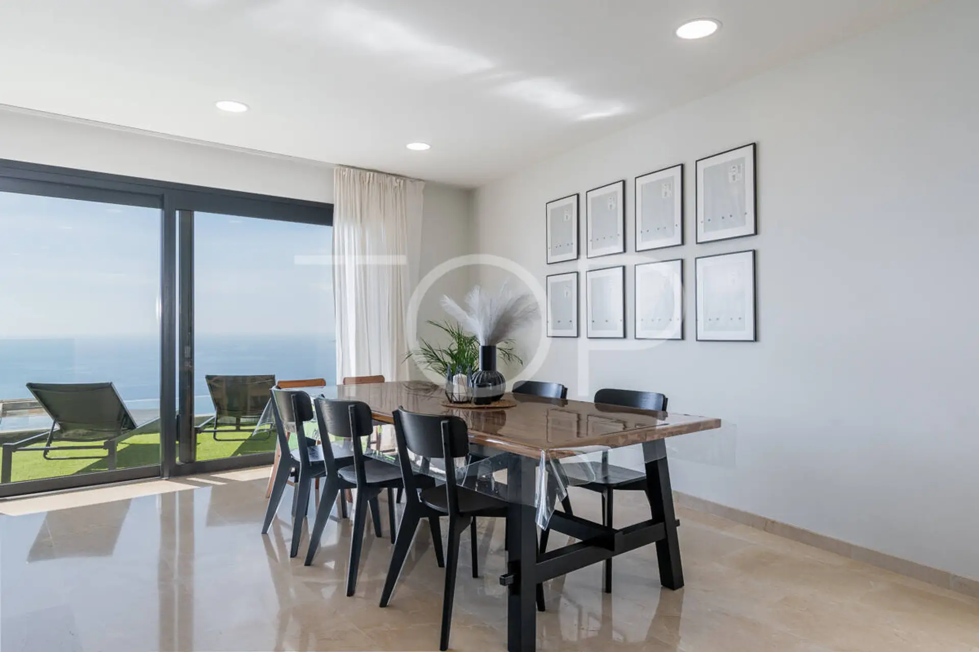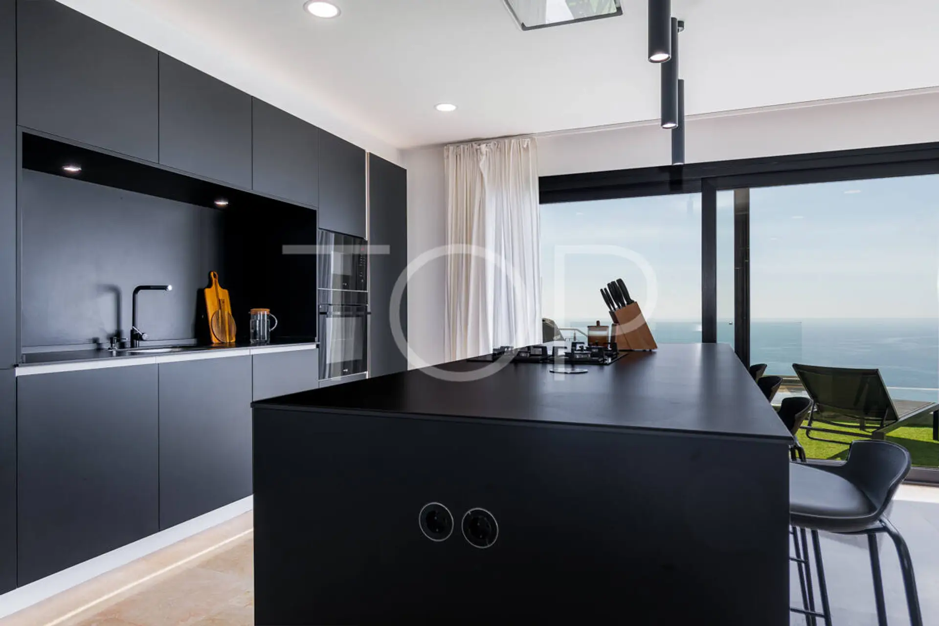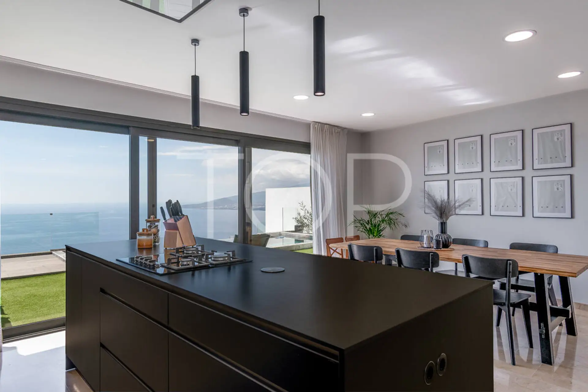 Auf der Hauptebene durchflutet natürliches Licht das geräumige Wohn-Esszimmer dank der großen Fenster mit direktem Zugang zur Hauptterrasse, auf der sich ein spektakulärer privater Infinity-Pool mit Meerblick und ein eleganter Chill-out-Bereich befinden. Die moderne, offene Küche, die mit den besten Geräten ausgestattet ist, schafft eine ideale Umgebung für das tägliche Leben und die Unterhaltung.