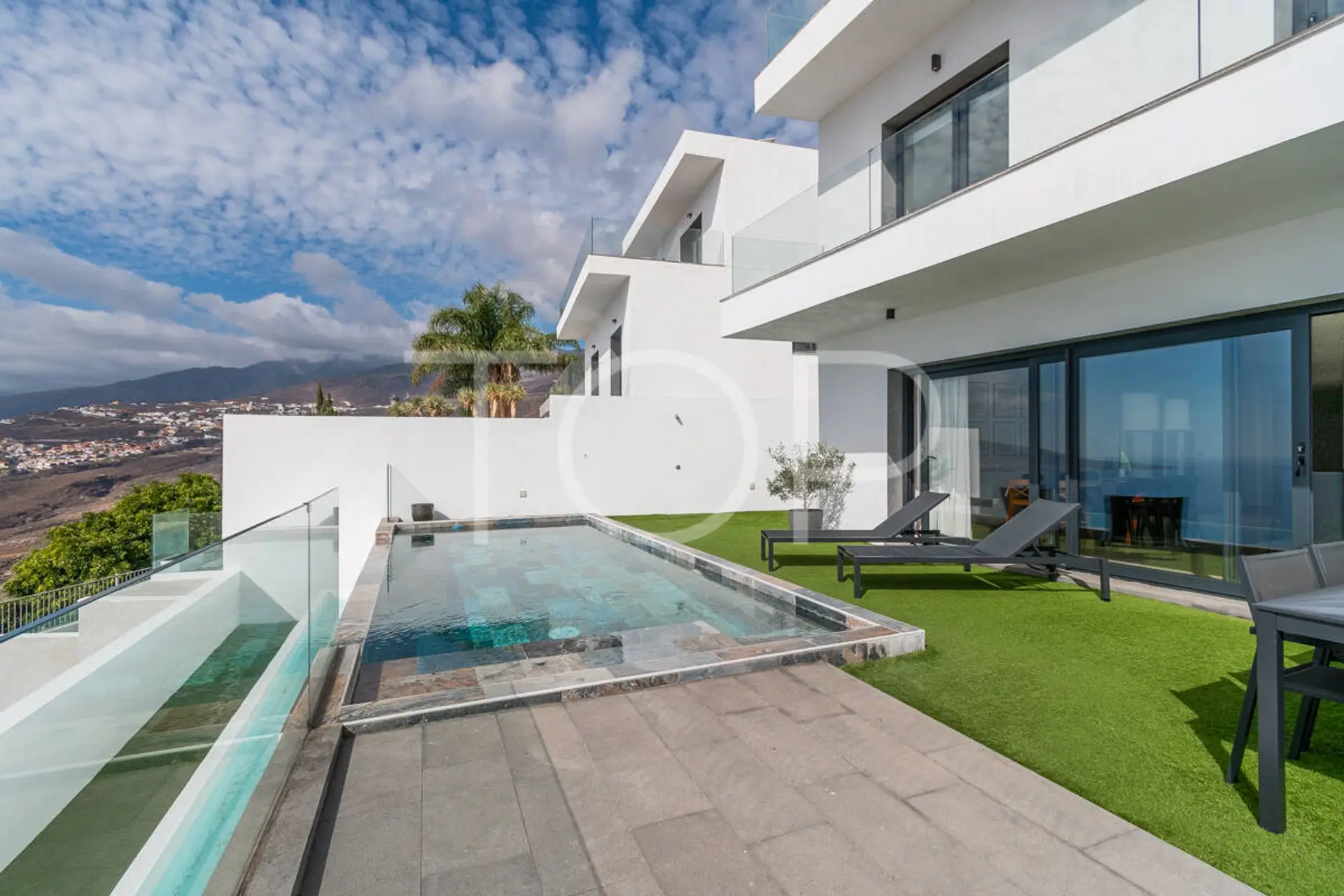 Im Außenbereich schaffen der Garten mit Naturrasen und der Infinity-Pool einen Ort der Entspannung mit einem der besten Ausblicke auf die Ostküste Teneriffas.