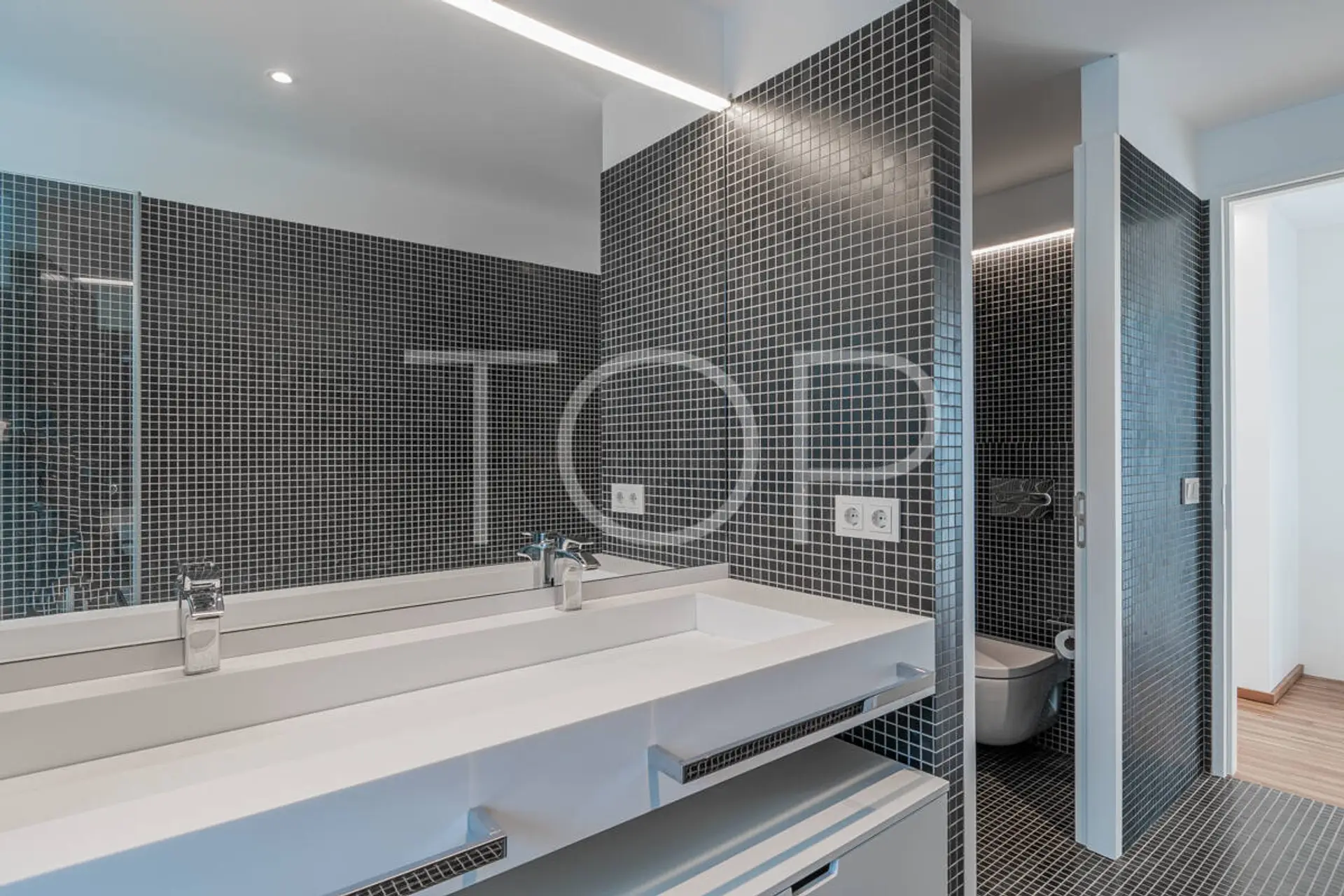 La villa alberga tres dormitorios cómodos, incluida la suite principal con baño en suite, vestidor y salida a la terraza. Los otros dos dormitorios cuentan con armarios empotrados y un diseño moderno. Un segundo baño con ducha contemporánea completa la zona de noche.