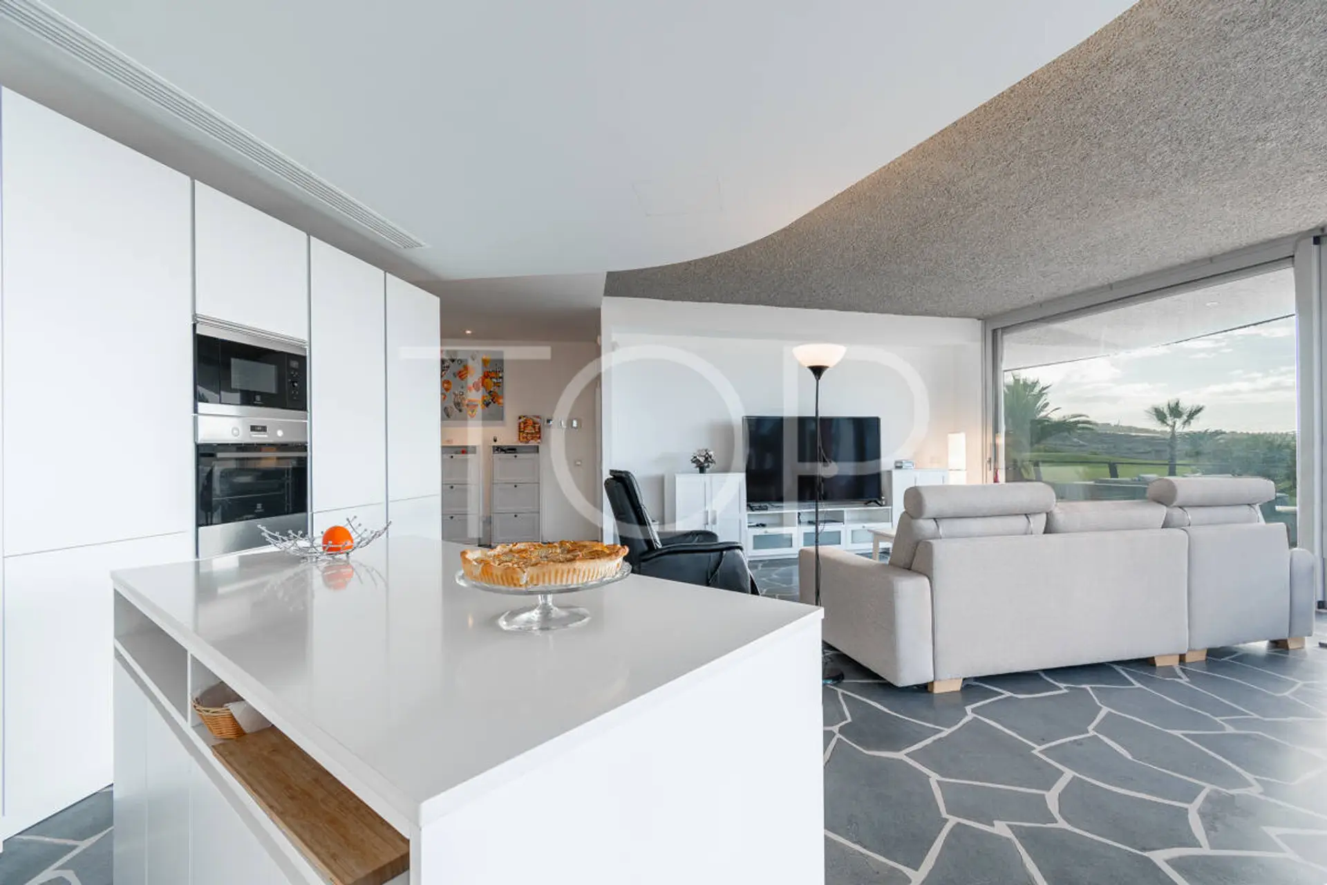 Esta lujosa villa de una sola planta, situada en la prestigiosa comunidad Bellevue Villas del Abama Golf Resort, combina diseño contemporáneo, elegancia y vistas espectaculares. El vestíbulo da paso a un amplio salón-comedor con cocina abierta de alta gama, que ofrece gran capacidad de almacenaje y máxima funcionalidad. El espacio interior se prolonga de forma fluida hacia el exterior gracias al suelo continuo de piedra y a los ventanales de suelo a techo que inundan la vivienda de luz natural. Desde aquí disfrutará de impresionantes vistas panorámicas al Atlántico y a uno de los mejores campos de golf de Europa. Tanto el salón como dos de los tres dormitorios se abren a la amplia terraza, creando una sensación de amplitud y luminosidad excepcionales.